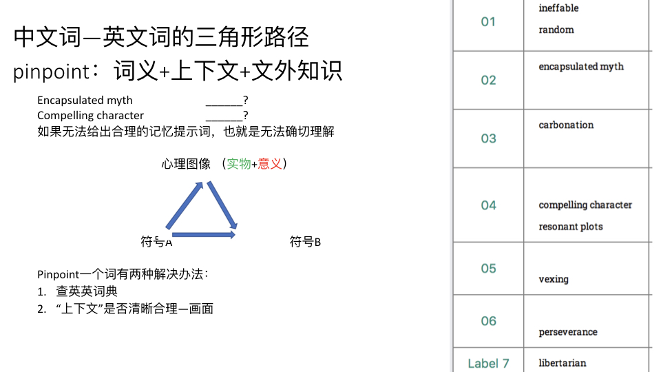 - 以意义作为联结,以迁移和类比,放进新的句子,形成新的意义;特定的故事/画面和由此建立起意义检索的搭配,形成长期记忆。